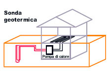 � le sonde geotermiche: in un foro di sondaggio viene introdotto uno scambiatore di calore che permette lo sfruttamento del differenziale termico esistente con il terreno circostante o con le acque di falda; essi operano su una differenza di temperatura di pochi �C e sono particolarmente adatte in caso si operi in un sottosuolo roccioso.