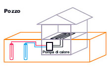 � i sistemi a pozzi di captazione e di reimmissione sfruttano l�acqua di falda come sorgente di calore; i sondaggi di captazione e di reimmissione sono normalmente meno profondi di quelli di una sonda geotermica, hanno un diametro maggiore e sono attrezzati con un�installazione per la captazione e la reimmissione.